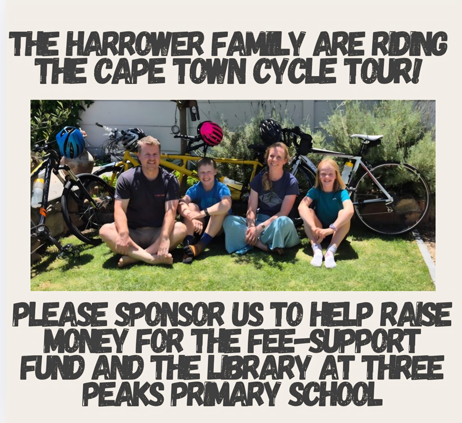 In three week's time, our grade 6&7 teacher, Mrs Harrower, will be riding the 2026 Cape Town Cycle Tour to support Three Peaks Primary School. This year marks a special milestone for the family, as Catherine’s husband, Neil, will be riding his 21st Cycle Tour, with Catherine and their children, Daniel (13) and Emily (11) joining in to mark the occasion.